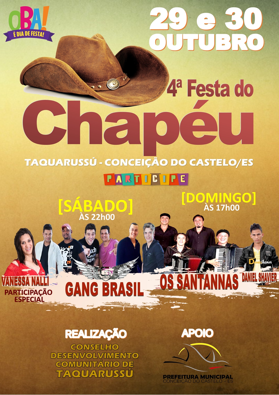 O Conselho de Desenvolvimento Comunitário de Taquarussú em Conceição do Castelo vai realizar no dia 29 de outubro, a 4ª edição da Festa do Chapéu e convida você e sua família para participar das festividades na comunidade. Conforme a programação, haverá show com a Banda Gang Brasil, Daniel Shavier e a participação especial de Vanessa Nalli, voltando aos palcos e relembrando sua época magnífica de ex-cantora da Banda Lorenson. O evento está marcado para começar a partir das 22h00. Te vejo lá! Confira na programação ao lado.