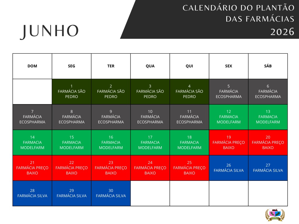 PLANTÃO DE FARMÁCIAS JUNHO - 2026