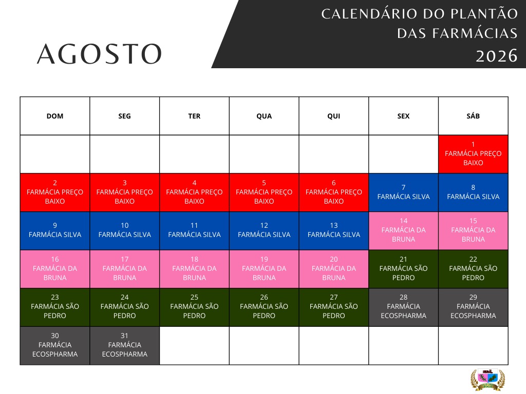 PLANTÃO DE FARMÁCIAS AGOSTO - 2026