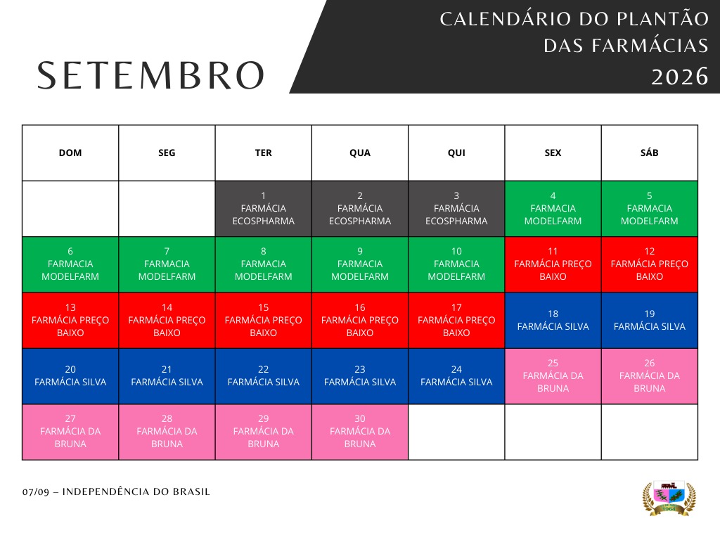 PLANTÃO DE FARMÁCIAS SETEMBRO - 2026
