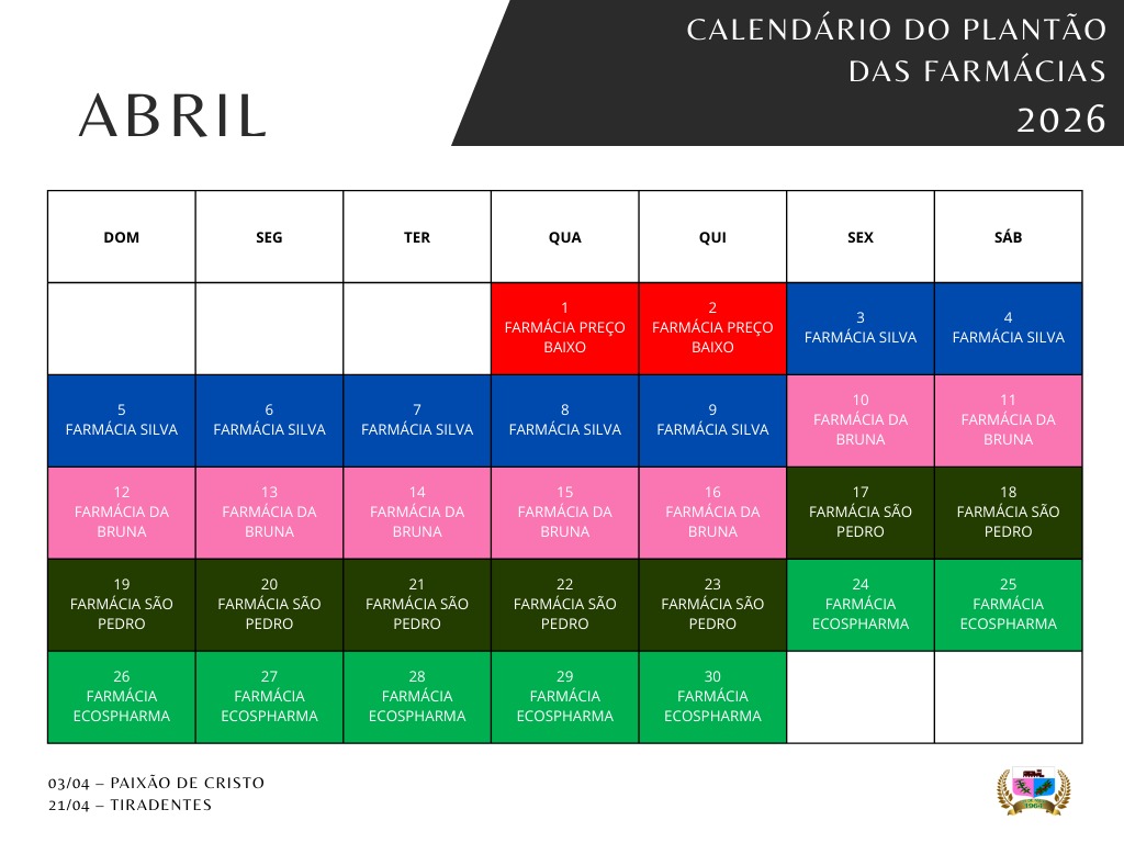 PLANTÃO DE FARMÁCIAS ABRIL - 2026